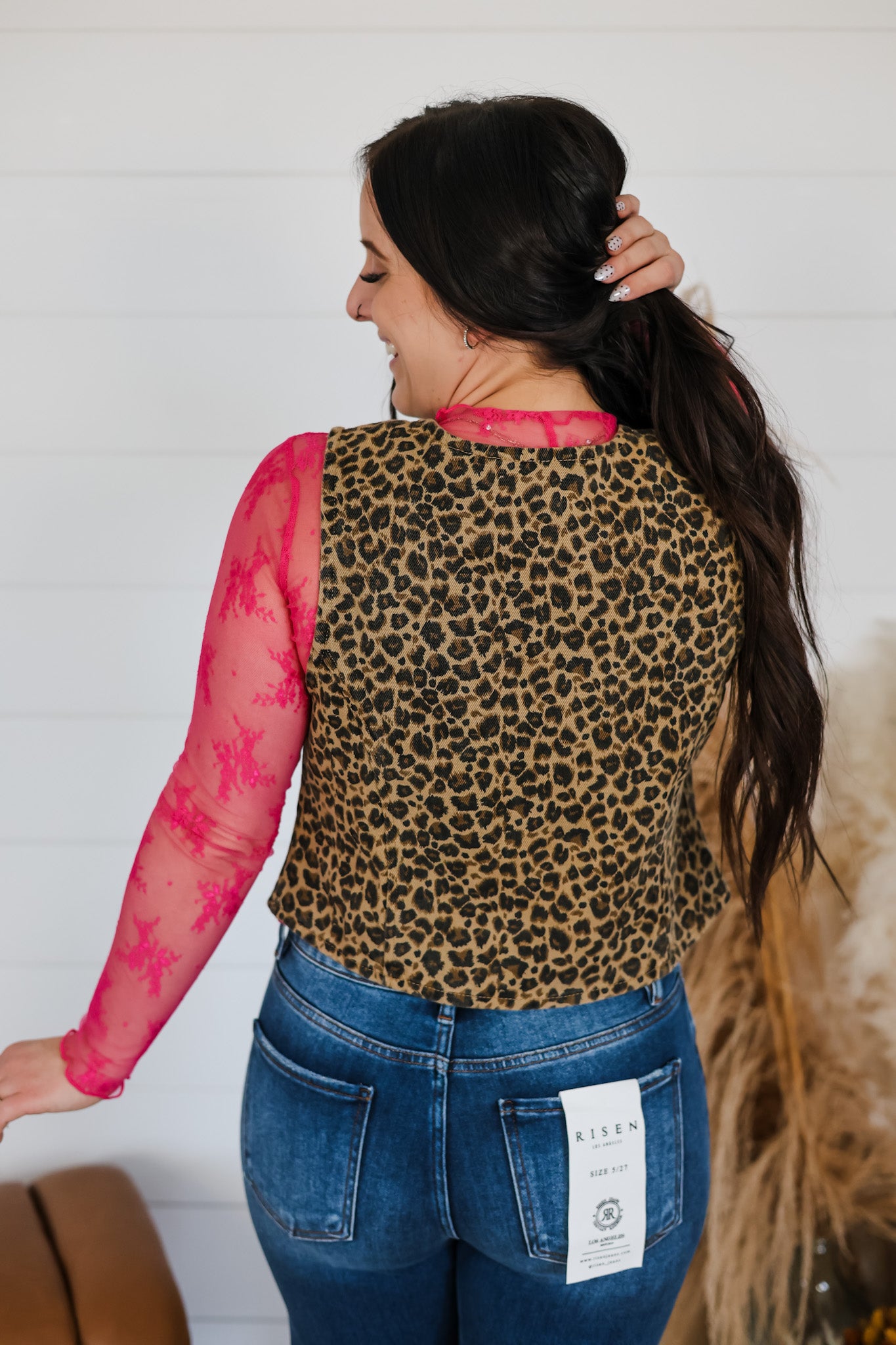 Layer up with our Wearing On Repeat Vest, a denim staple with a wild twist. This button-up vest features a bold leopard print that transforms any outfit from basic to bold. Perfect for throwing over your favorite tee or dress, it's the versatile piece you'll reach for again and again. The classic denim construction keeps things timeless while the eye-catching pattern adds serious personality. Whether you're dressing up or keeping it casual, this vest is your new go-to for effortless style.