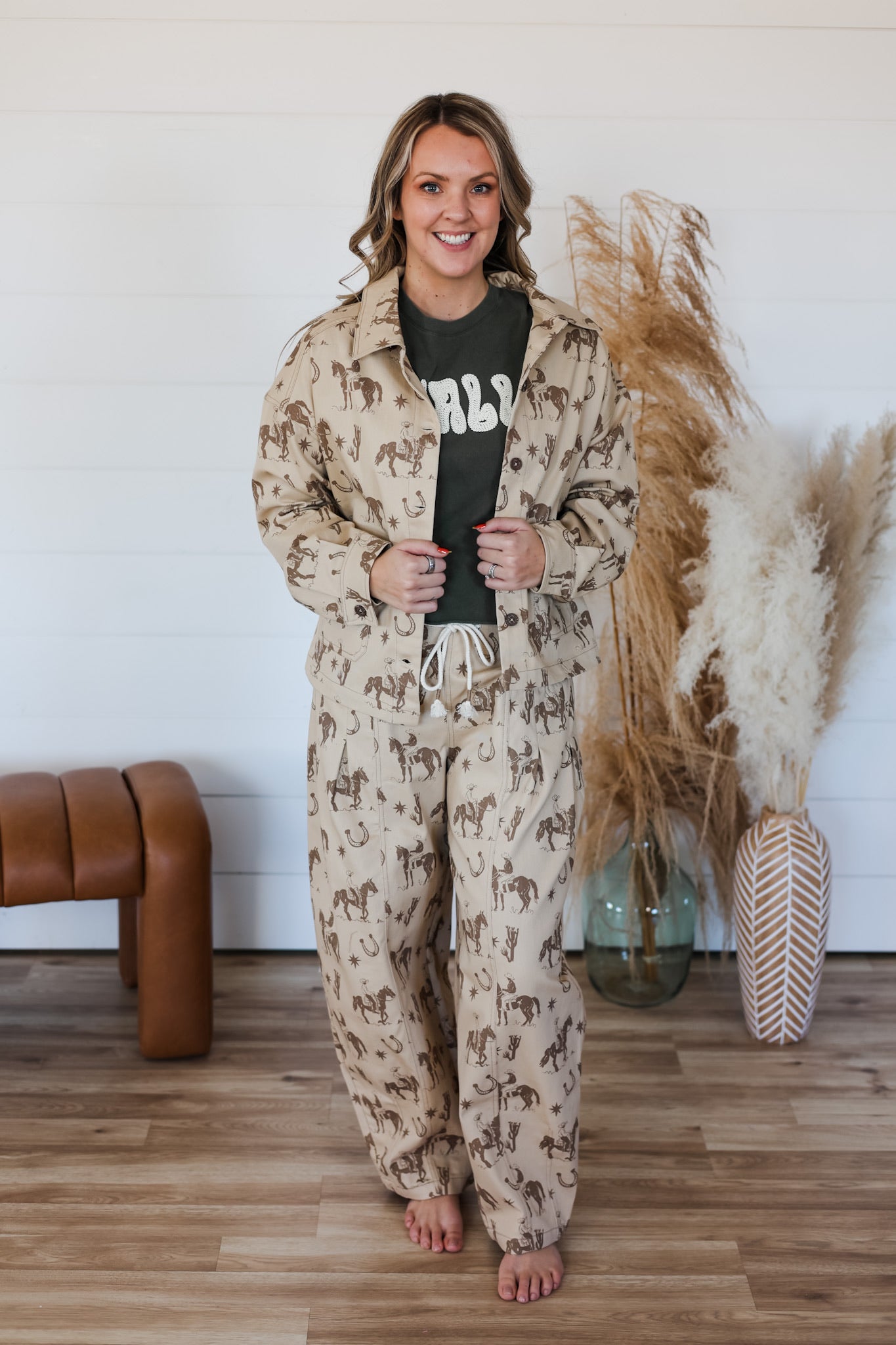 Saddle up in this oversized graphic shacket that's equal parts wild and wearable. Featuring a classic button-down front, long sleeves, and handy side pockets, it's the perfect layer for throwing over everything in your closet. Whether you're channeling cowboy cool or just need a cozy companion for casual days, this jacket delivers style with a fun, fearless attitude. Giddy up!