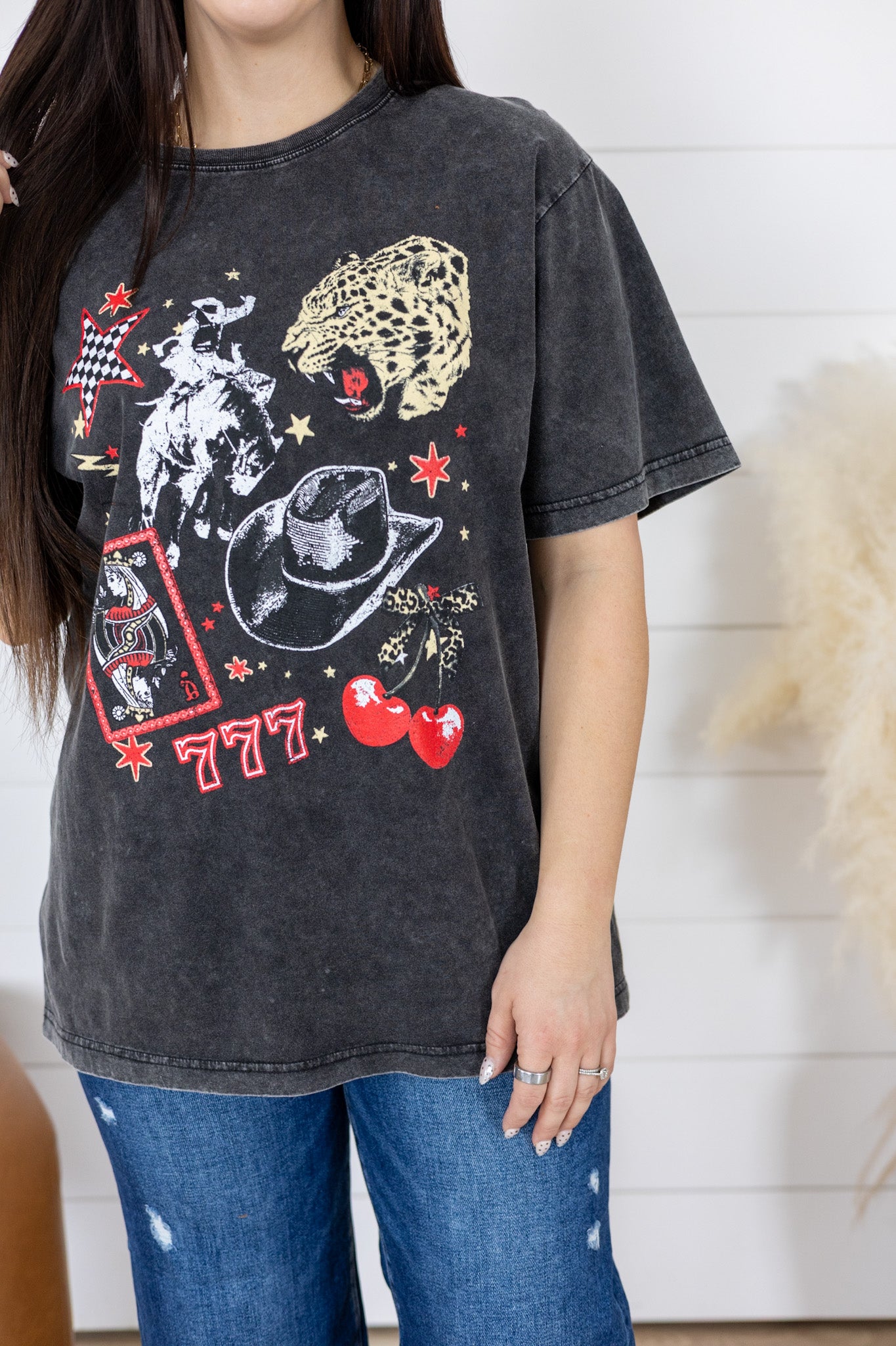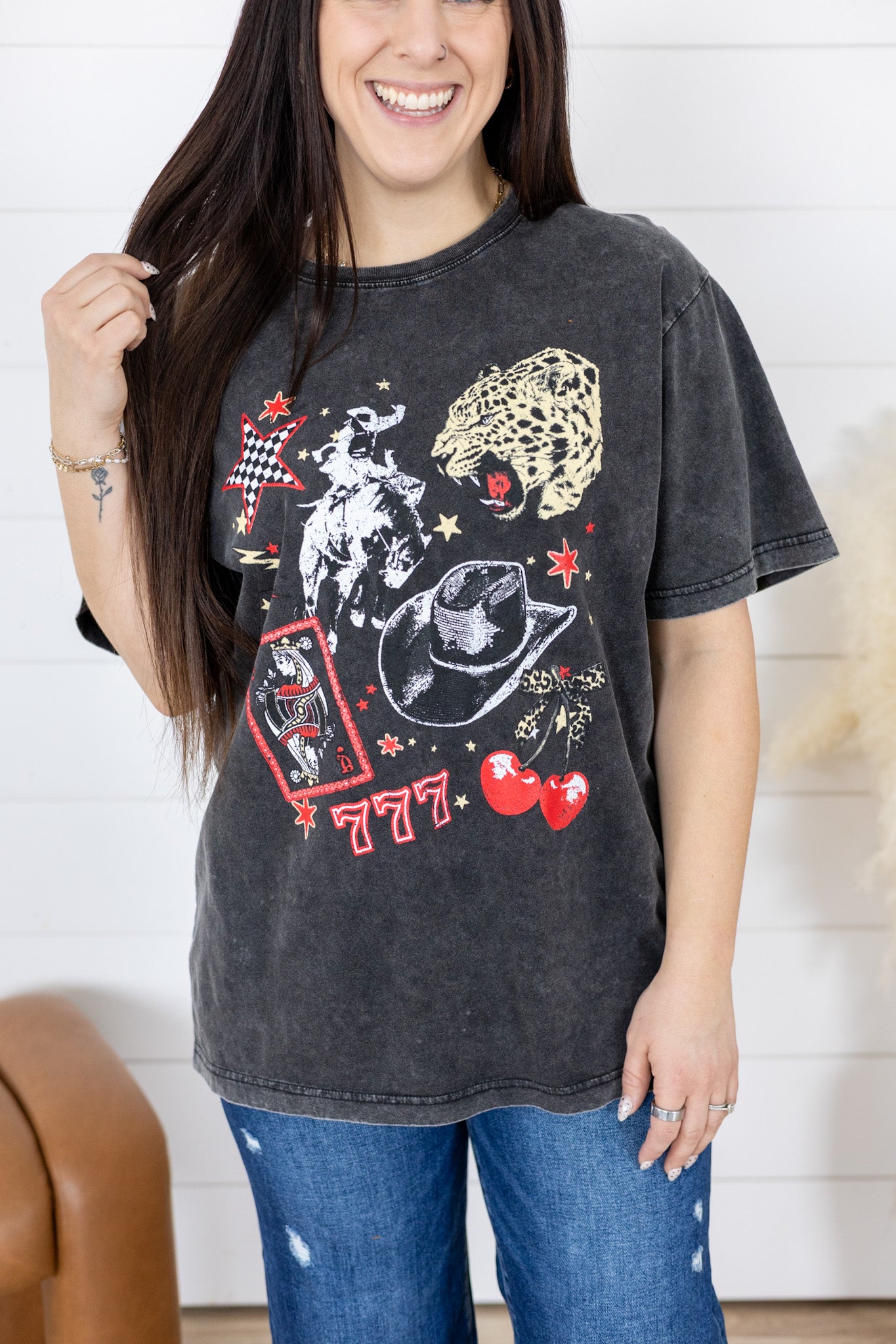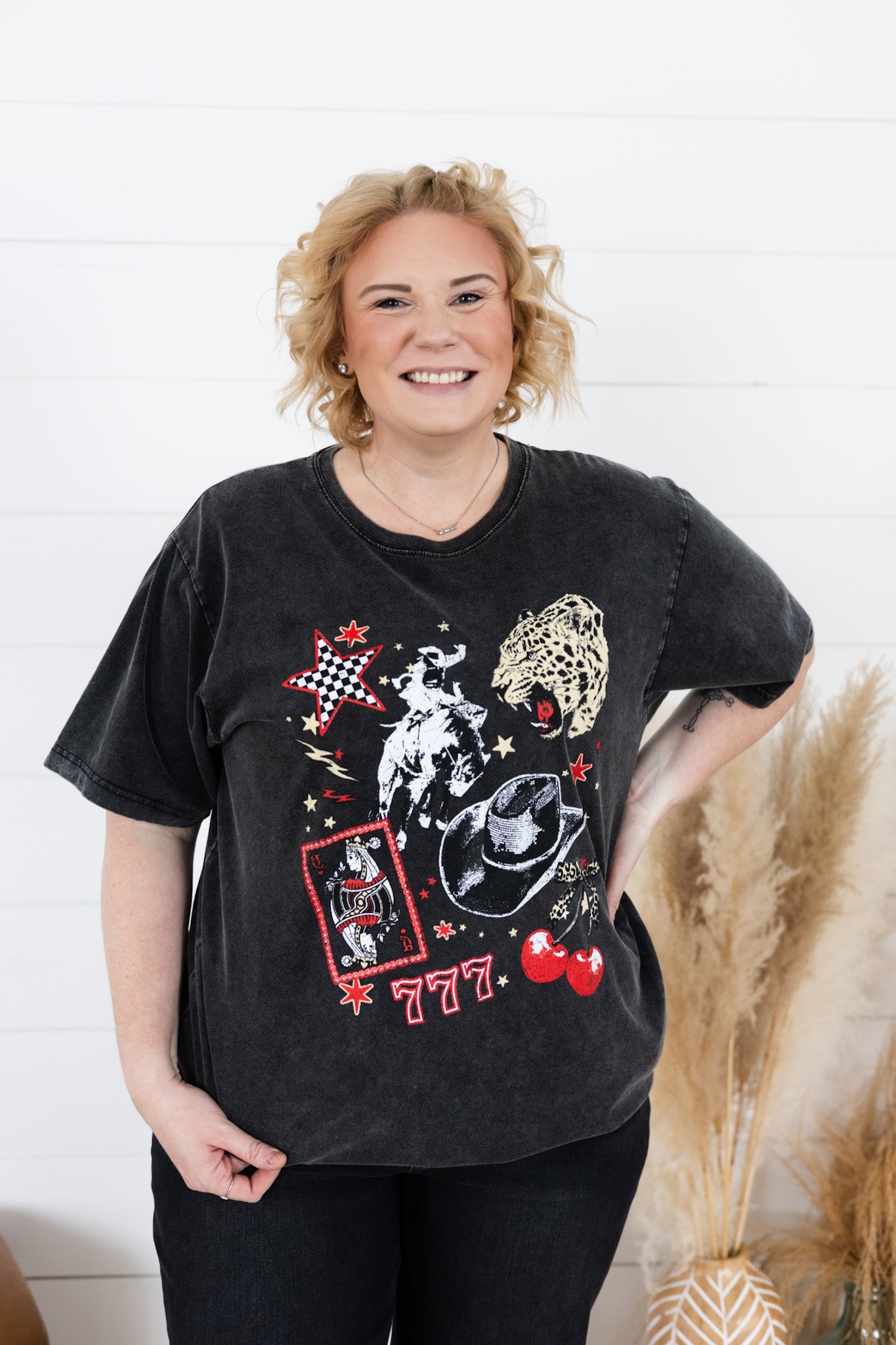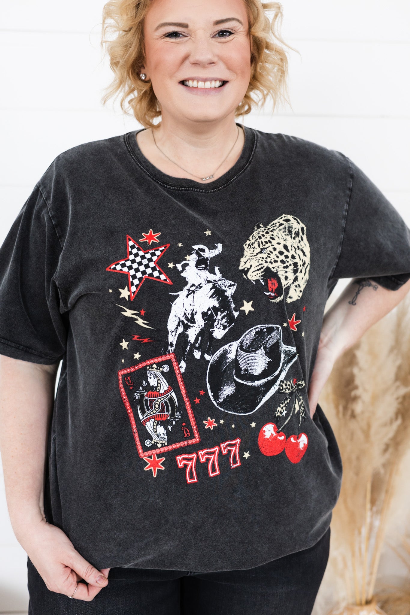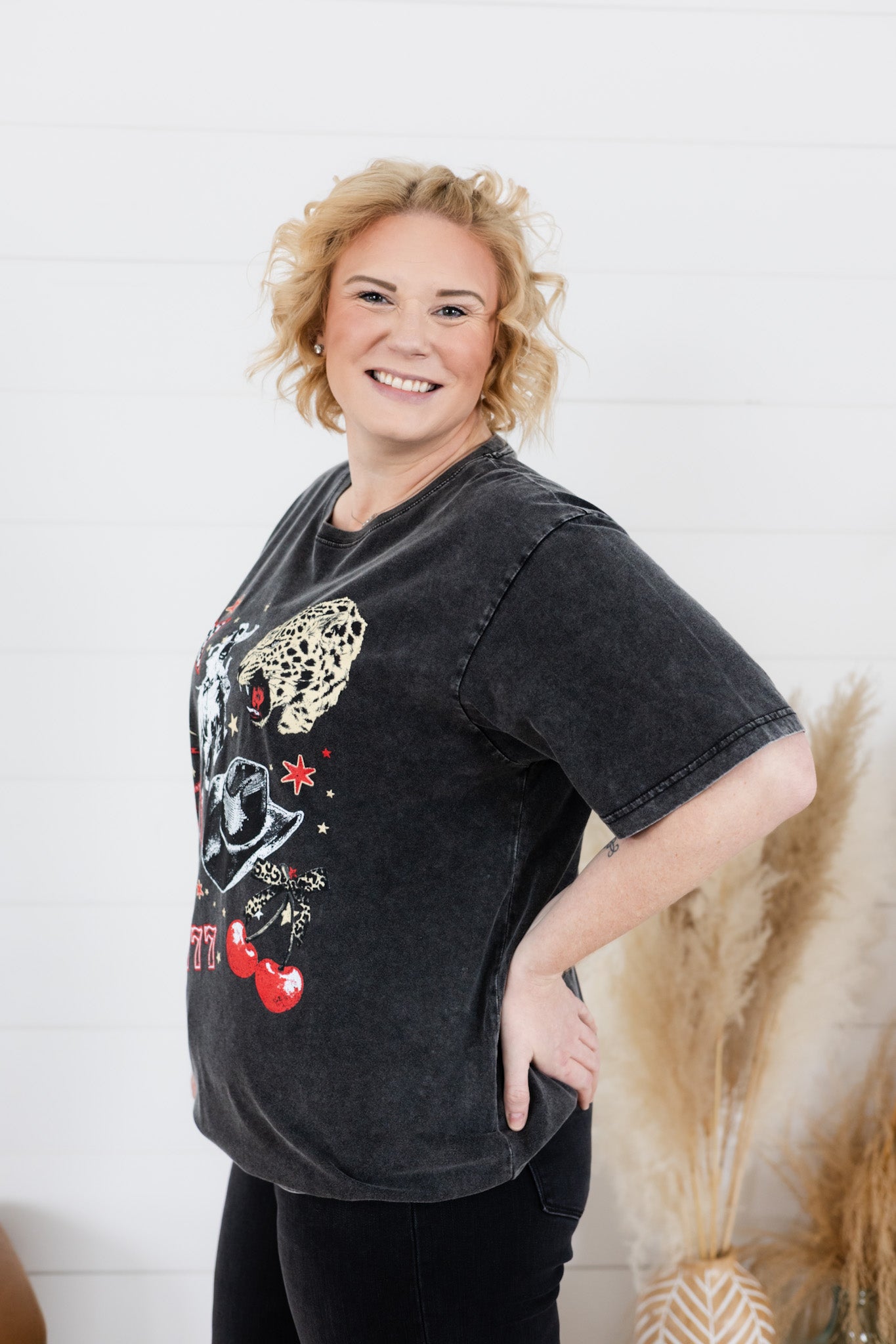 Make a statement with this oversized acid wash graphic tee that's ready for anything your day throws at you. The relaxed fit and vintage-inspired wash give off effortless cool vibes, while the bold western graphic adds personality to your everyday rotation. Throw it on with jeans, shorts, or layer it over your favorite basics—this versatile piece works as hard as you do. Perfect for casual hangouts, running errands, or just living your best laid-back life.