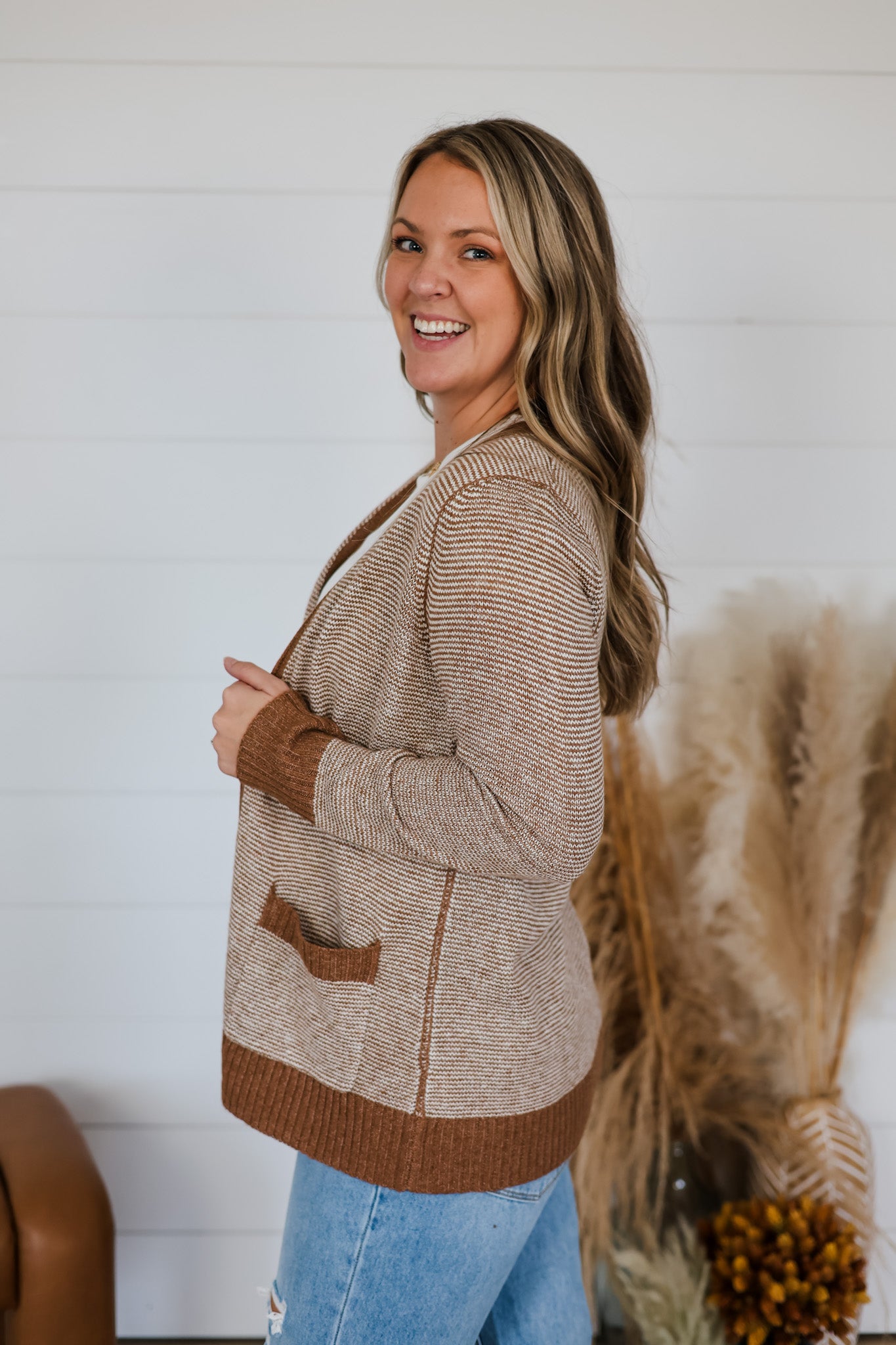 Layer on the charm with this open-front cardigan that's equal parts sophisticated and fun. Crisp pinstripes meet bold contrast trim for a look that effortlessly elevates any outfit. Throw it over your favorite tee or dress it up for a polished finish. Perfect for those moments when you want to add personality and warmth without trying too hard. A wardrobe essential that works as hard as you do.