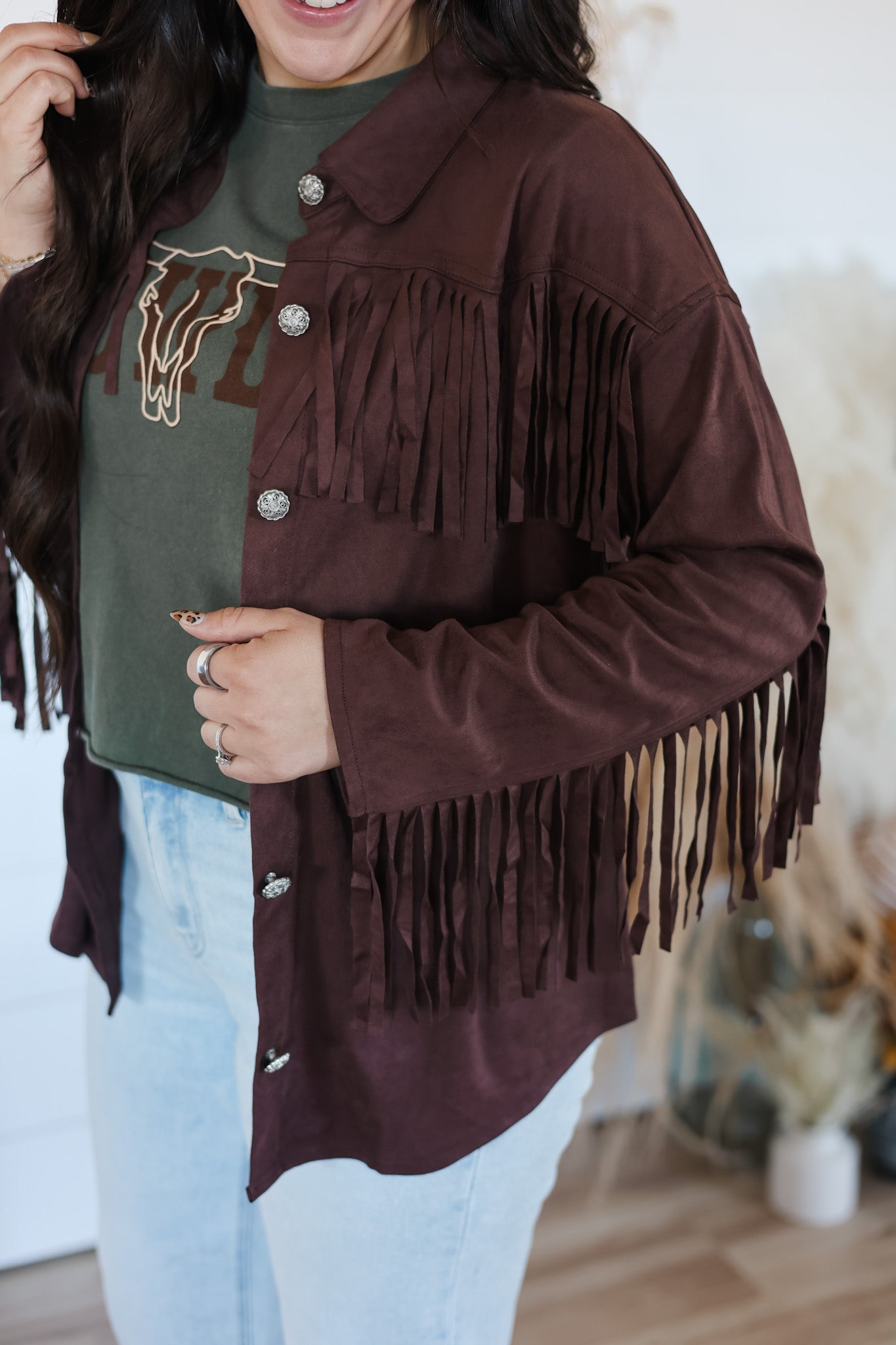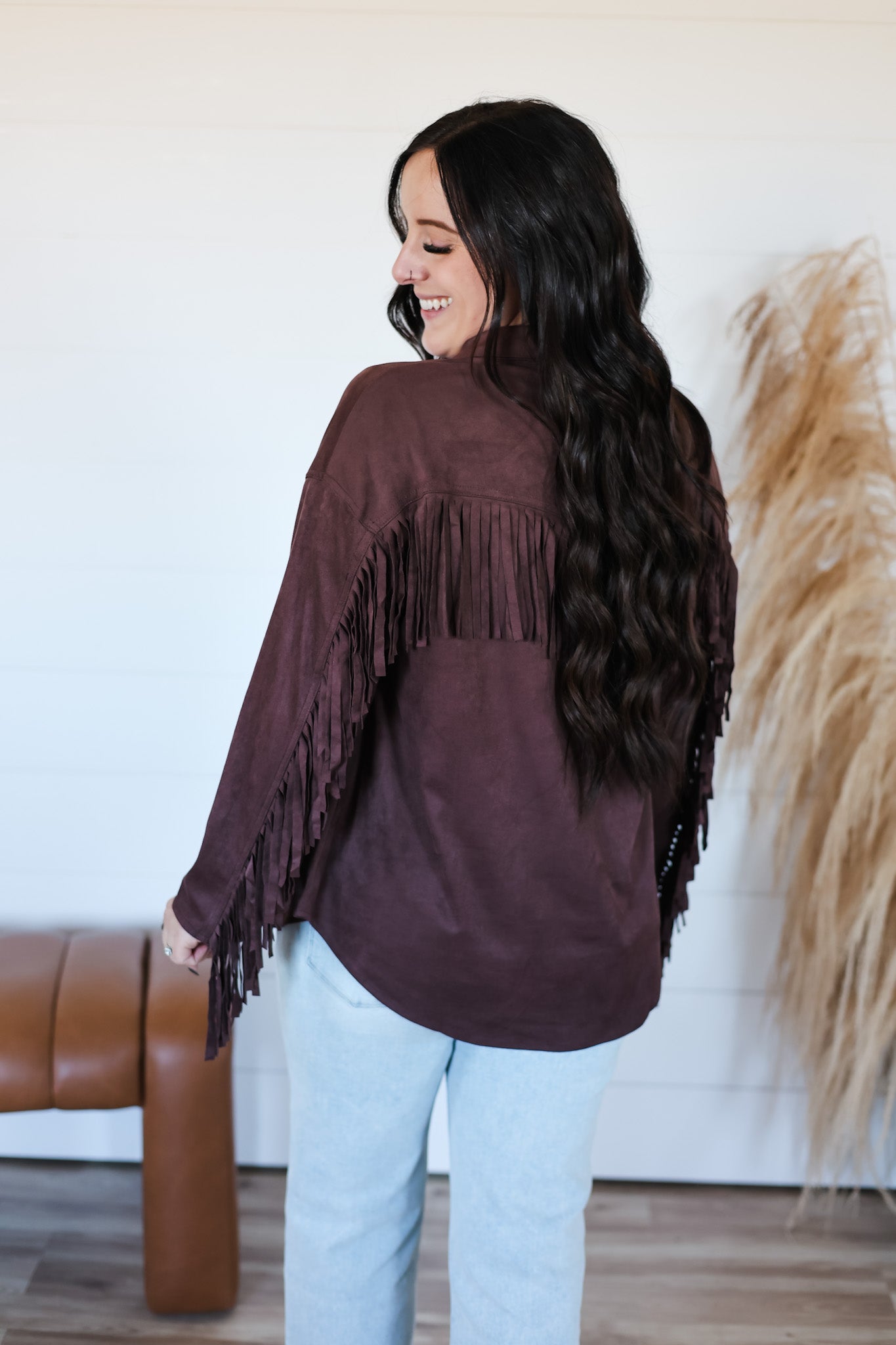 Wrap yourself in effortless cool with the With The Wind Jacket. This stretchy suede piece combines comfy flexibility with eye-catching front buttons and playful fringe sweeping across the back. Perfect for adding a touch of flair to any outfit while keeping you cozy and free to move. Let your style catch the breeze!