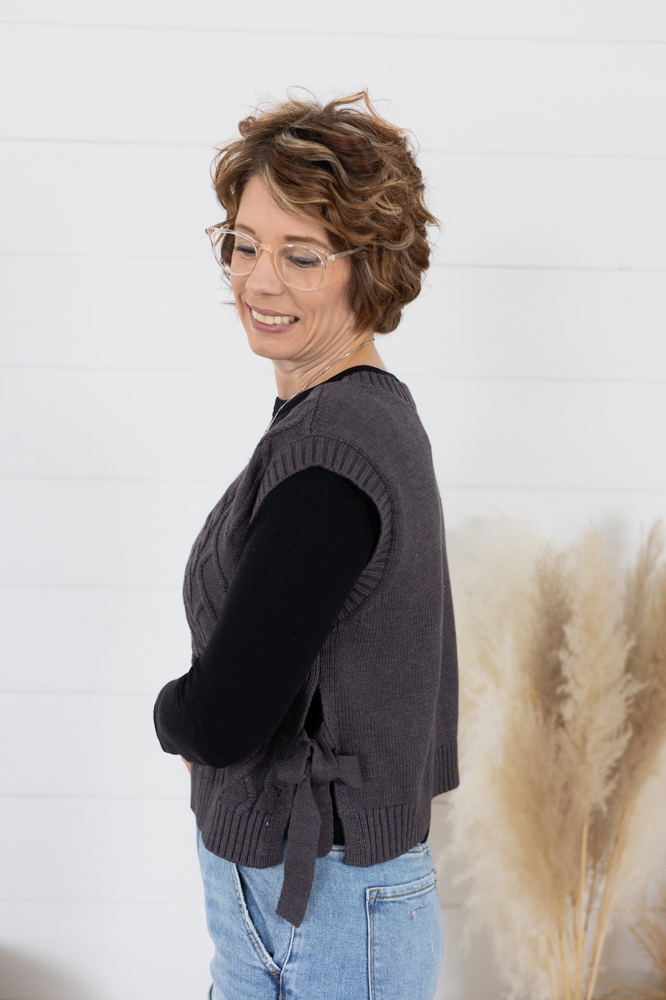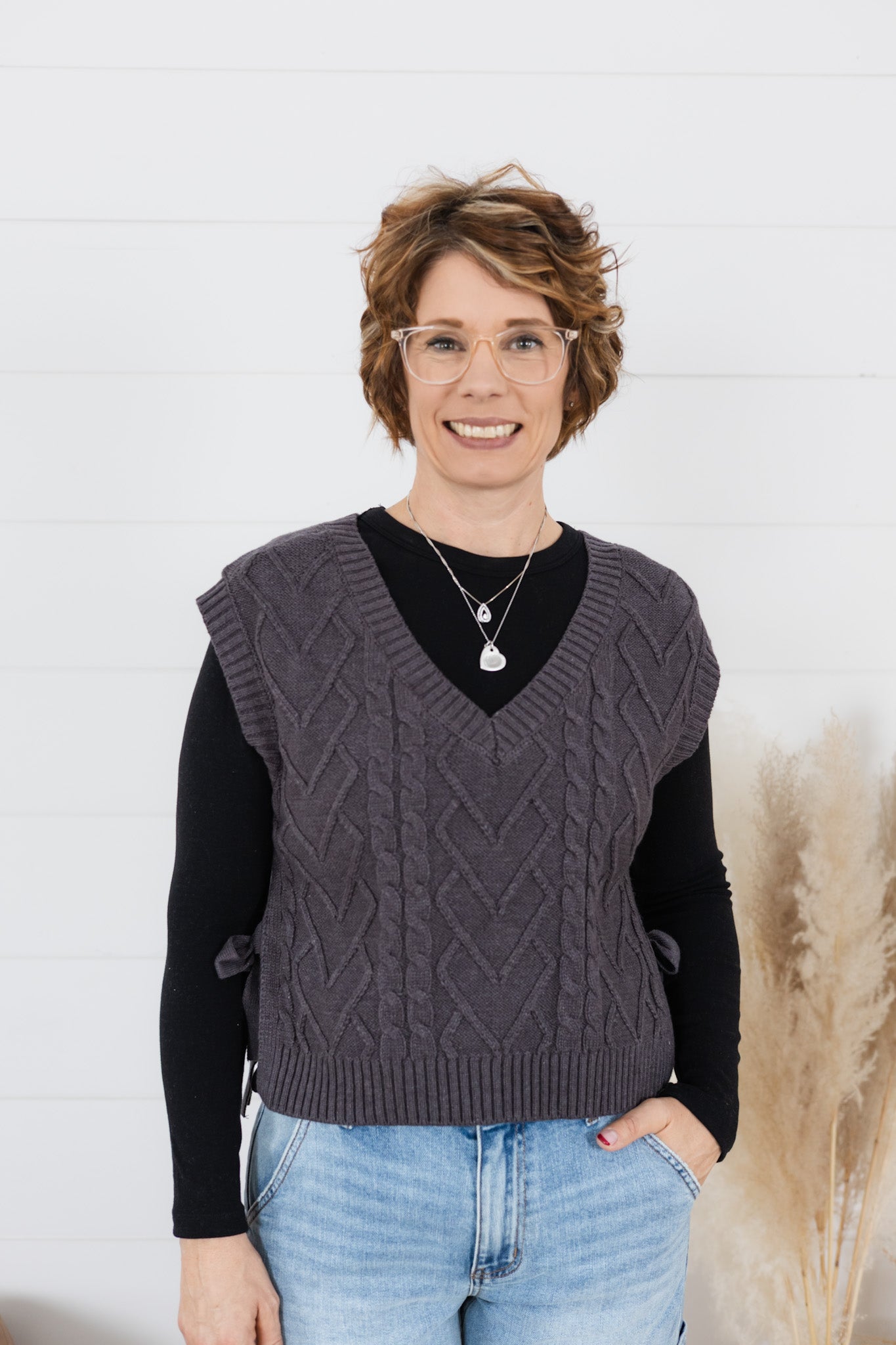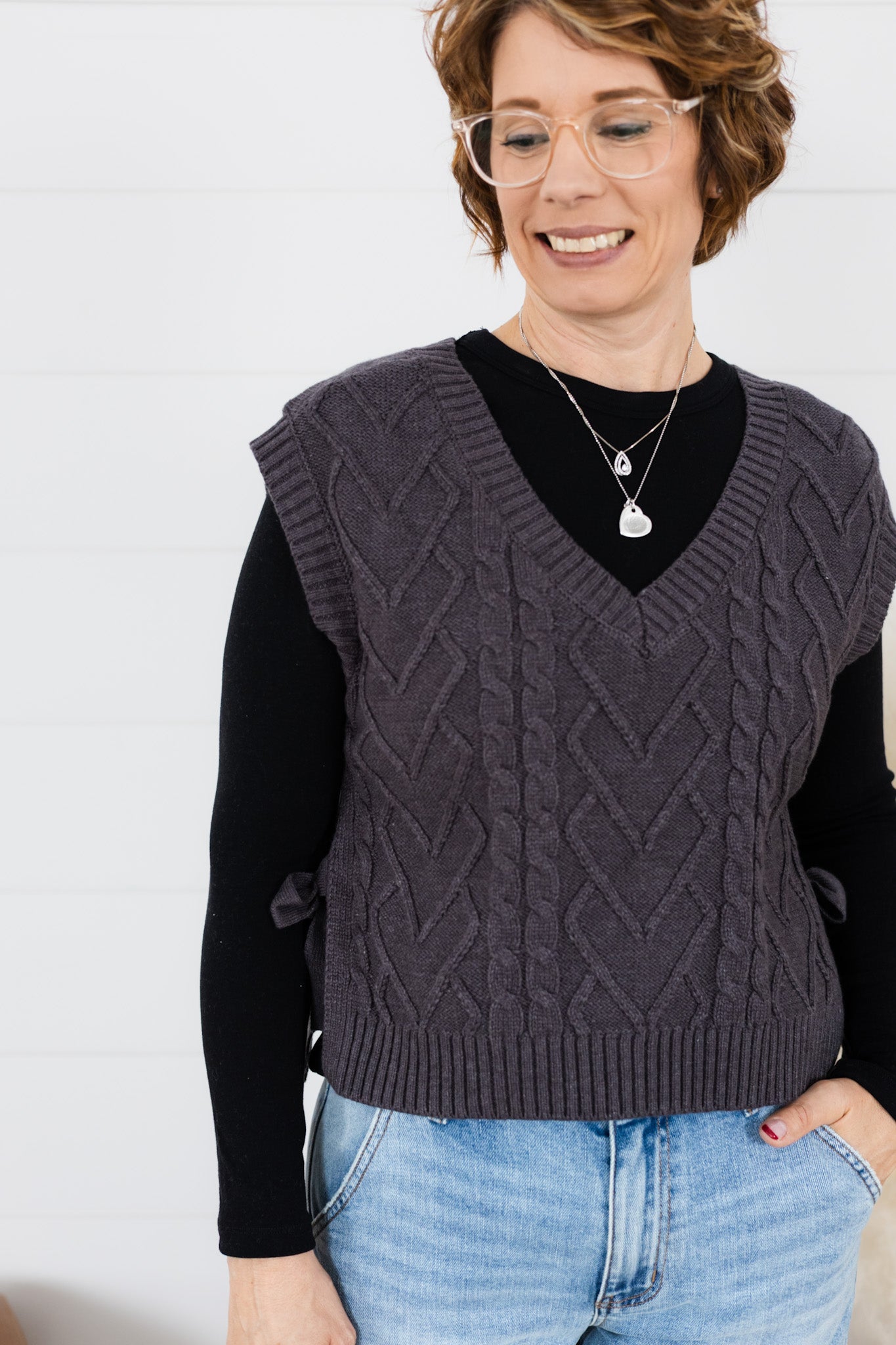 Cozy meets chic in the Work It Out Top, a cable knit V-neck sweater vest with playful side tie details. Perfect for layering or wearing solo, this vest adds a fun twist to your everyday look while keeping you comfortably stylish. Ideal for turning heads with a hint of flirty charm!