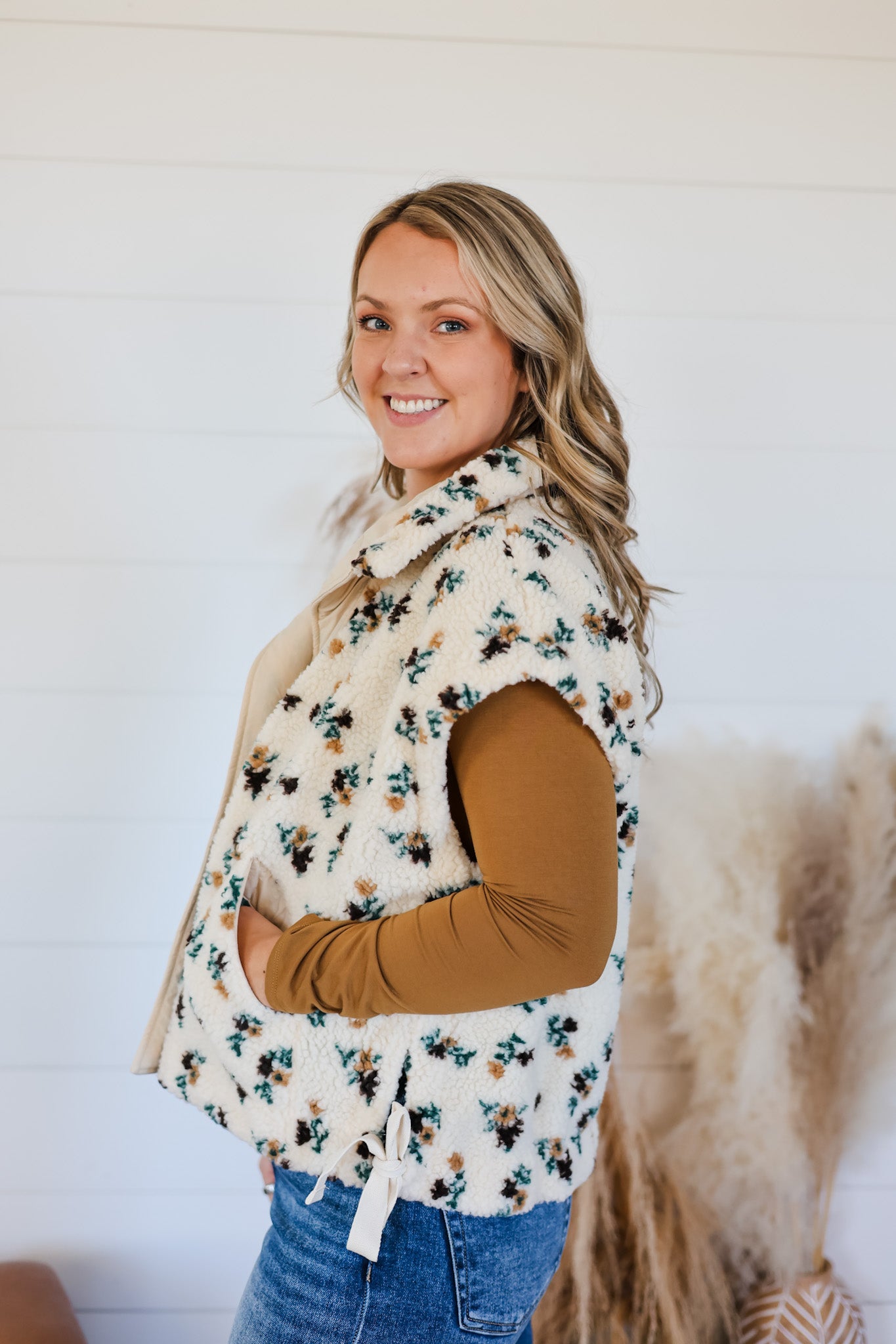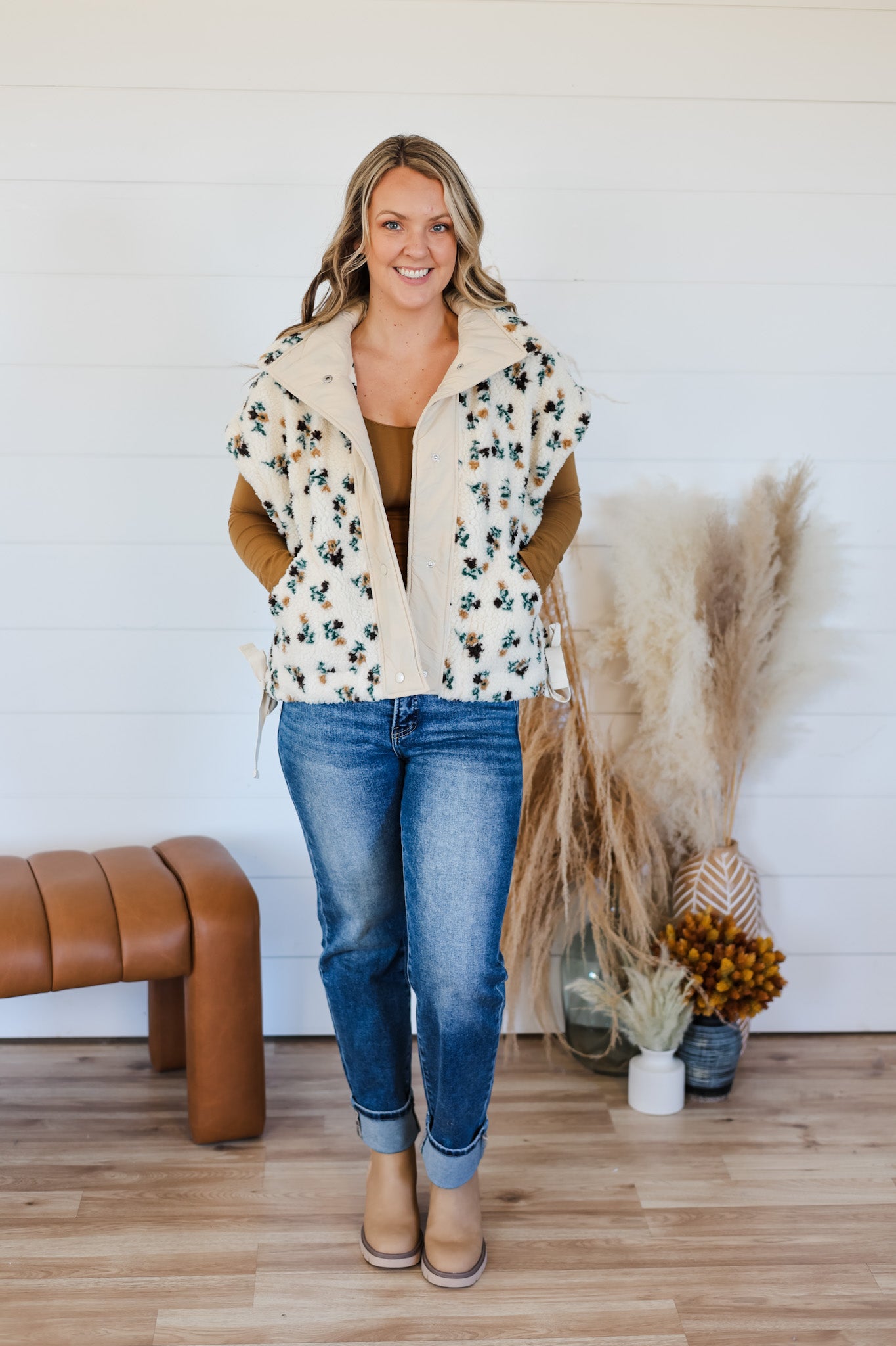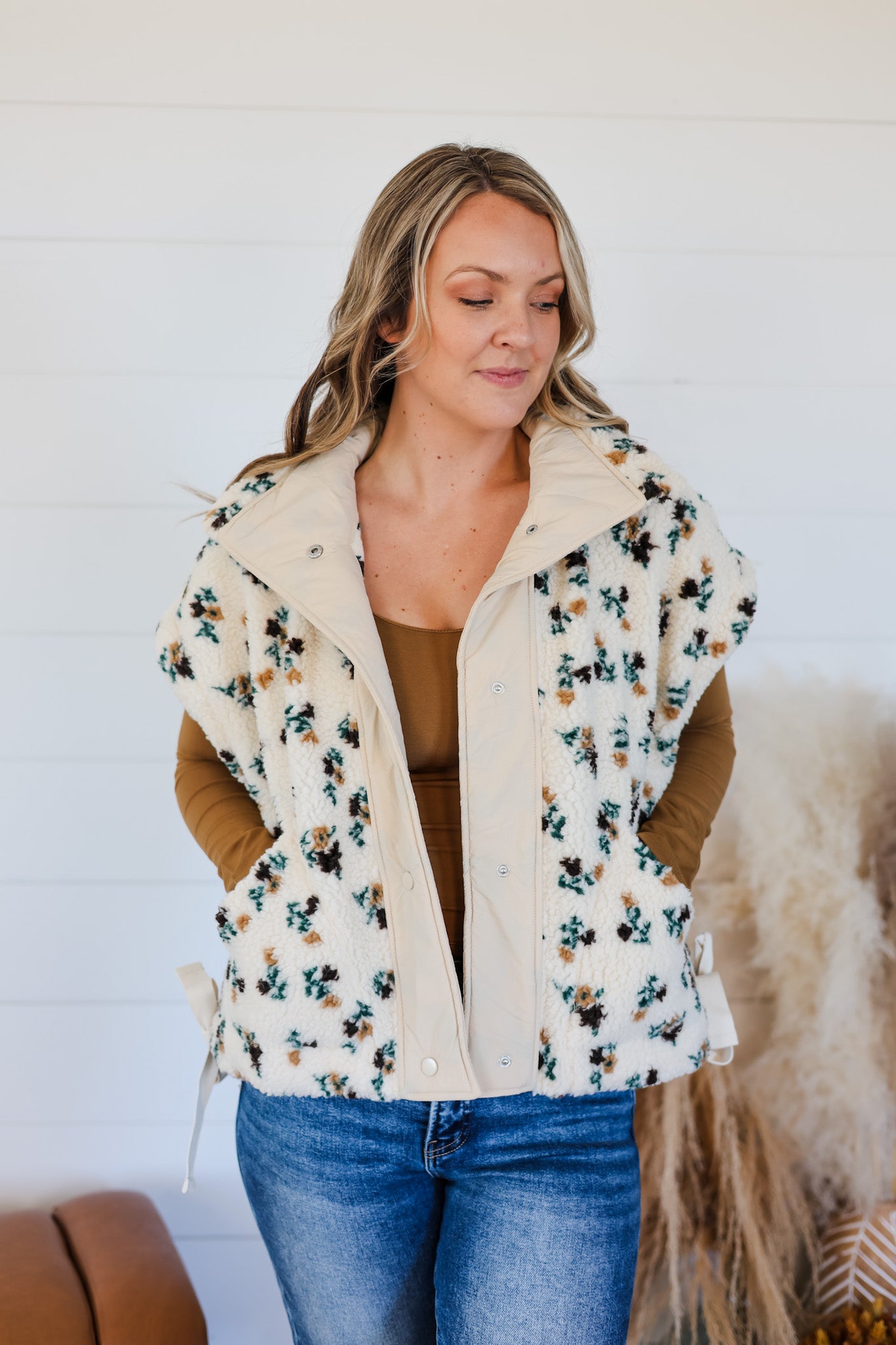 Wrap yourself in cozy comfort with the You Belong Vest, a floral oversized sherpa dream that's perfect for layering. This sleeveless wonder features a soft, plush texture that feels amazing against your skin, snap front buttons for easy on-and-off, and functional side ties to cinch your silhouette just right. Plus, practical pockets keep your essentials close. Whether you're lounging at home or running errands, this versatile vest adds warmth and style to any outfit. Embrace the softness—you belong in comfort.